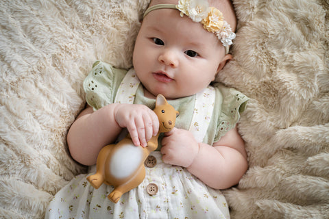 The kangaroo is part of our Tikiri Australian Animal collection. There is a bell inside the kangaroo which makes a sweet sound to delight your child as they are playing with it.