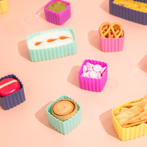 Designed to fit perfectly into MontiiCo Bento Lunchboxes, the Mixed Bento Cup set contains 2 square bento cups & 1 rectangle bento cup.